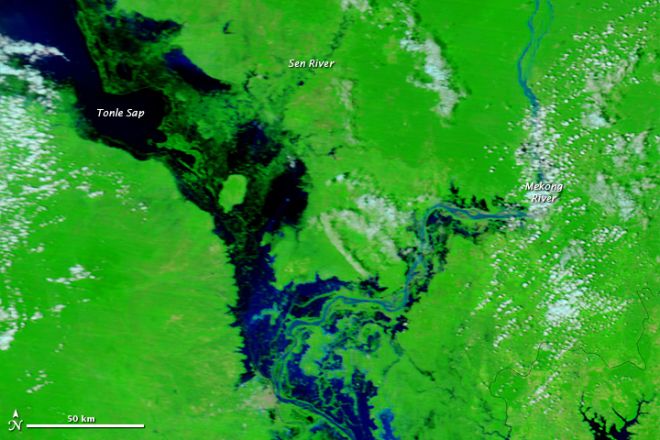 Spektakuläre Satellitenaufnahmen der NASA vom 18. Oktober zeigen das ganze Ausmaß der Flut: Phnom Penh liegt derzeit südwestlich eines riesigen Sees und bildet mit dem Tonle Sap eine Durchgängig überflutete Fläche. Im Vergleich dazu zeigen vergleichbare Bilder aus dem Jahr 2006, dass eine Regenzeit auch zu deutlich weniger Hochwasser führen kann. Auf beiden Aufnahmen ist einzig der Mekong noch recht gut erkennbar.
