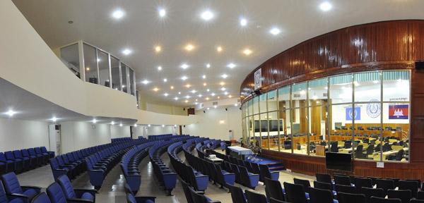Im Herz des Tribunals: Der Gerichtssaal unterteilt sich in Tribüne, die vom Verhandlungsraum durch eine durchgehende Glasscheibe abgetrennt ist. Foto: ECCC