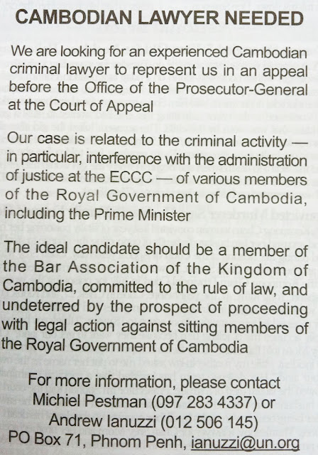 Unterdessen führt Michiel Pestman, einer der Anwälte von Nuon Chea, seinen Kampf gegen Kambodschas politische Elite unverdrossen fort. Vor zwei Wochen versuchte er, die Rolle des ehemaligen Parteichefs und amtierenden Parlamentspräsidenten Heng Samrin bei der Eroberung Phnom Penhs 1975 vor dem Tribunal zu thematisieren – allerdings ohne Erfolg, da der vorsitzende Richter Nil Nonn dem Angeklagten eine Aussage dazu untersagte. Das Klima zwischen dem Holländer und dem Vorsitzenden scheint mittlerweile zerrüttet zu sein, wie der rüde Tonfall des kambodschanischen Richters nahelegt. (Auch Nancy Cartwright, neuseeländische Richtern im Hauptverfahren, hat es auf Pestmans Abschussliste geschafft.) Doch weil in Pestmans Verständnis des kambodschanischen Staates Nil Nonn sowieso kein unabhängiger Richter, sondern nur der ausführende Arm von Premierminister Hun Sen ist, knöpft er sich den Regierungschef gleich lieber selbst vor. Obwohl eine gegen Hun Sen und andere Spitzenpolitiker eingereichte Klage im Herbst noch abgewiesen worden war, bleibt Pestman im Angriffsmodus (was, wie die Geschichtsbücher zeigen, nicht viele überlebt haben). Nun hat er auch beim Tribunal beantragt, ein Schnellverfahren gegen den Premierminister zu eröffnen, um „weiteren Schaden“ für Prozess 002 zu verhindern. Hun Sen hatte sich vietnamesischen Medien gegenüber zuvor recht deutlich über die Schuld von Nuon Chea geäußert, was Pestman als wirkungsvolle Einflussnahme auf das Tribunal kritisierte. Doch der gescholtene will sich das nicht gefallen lassen und rief in dieser Woche seine Anhänger dazu auf, dem „internationalen Anwalt“ es nicht durchgehen zu lassen, sich „arrogant“ aufzuführen. Pestman hat sich davon aber ganz offensichtlich (noch) nicht beeindrucken lassen und kündigt an, die von ihm initiierten Verfahren „mehr denn je“ durchziehen zu wollen. Und um keinen Zweifel an seiner Mission aufkommen zu lassen nennt er bei der öffentliche Suche nach einem kambodschanischen Anwalt auch klipp und klar, worum es geht (siehe Zeitungsausschnitt vom 2. Februar 2012).