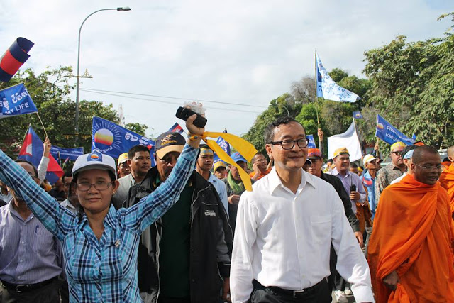 Angeführt von Parteipräsident Sam Rainsy marschieren rund 1000 Anhänger der Opposition knapp acht Kilometer von der Parteizentrale in Chak Angrae bis zum Freedom Park in Daun PPenh. Später war es dann nicht mehr ganz so friedlich. (Foto: PRKN)