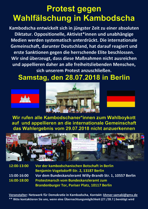 Am Sonntag wählen die Kambodschaner ein neues Parlament, und der Sieger steht mit Hun Sen vorher schon fest. Das Netz ist zurzeit voll mit Analysen und Kommentaren, die – wenn sie denn unabhängig zustande gekommen sind – sich häufig nicht wesentlich voneinander unterscheiden. Was bisher weitgehend unbeachtet geblieben ist (in den englischsprachigen Medien sowieso), ist die deutsche Perspektive, denn die politische Konfrontation in Kambodscha ist mittlerweile auch in der Bundesrepublik angekommen. Am kommenden Samstag wird sie an prominenter Stelle wieder öffentlich sichtbar: In Berlin wird erst vor der kambodschanischen Botschaft, später vor dem Kanzleramt und dem Brandenburger Tor demonstriert. Organisator ist das „Netzwerk für Demokratie in Kambodscha“, das in regelmäßigen Abständen Veranstaltungen und Kundgebungen auf die Beine stellt, die den Autokratisierungstrend unter Hun Sen thematisieren.