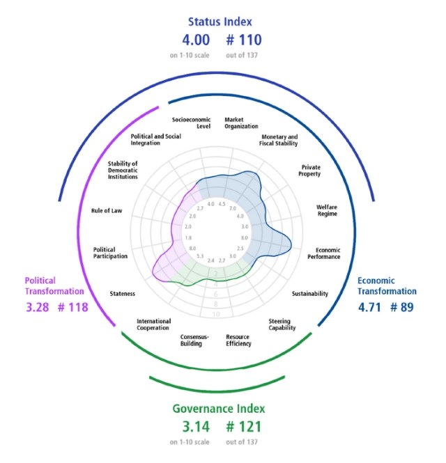 Noteworthy, despite of the dissolution of the opposition party by court rule in November 2017, the gradation of Cambodia’s political transformation appears moderately. “The dissolution was only the final step of a willful destruction of political competition since 2015. Although the unleashing of the opposition is a turning point, it has not significantly changed the political system as the autocratic elements have already prevailed before”, Dr. Markus Karbaum says, Cambodia country expert and author of the Cambodian chapter. Similarly, Cambodia also shows setbacks in the governance sub-index. Regarding its anti-corruption policy and the dominance of anti-democratic actors, the country falls on the lowest score possible.